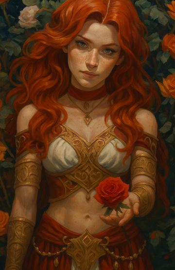 She is never seen without her symbol of the Firehair, Sune, set in a pendant upon a red velvet choker around her neck, and various jewelry adorning her, both visible and not, including of note, heart teardrop piercings of gold and ruby upon her nipples, often glimpsed through the haze of the diaphanous fabric of her priestly vestments. She has one tatto on her person: a rose vine twining its way up her left thigh.